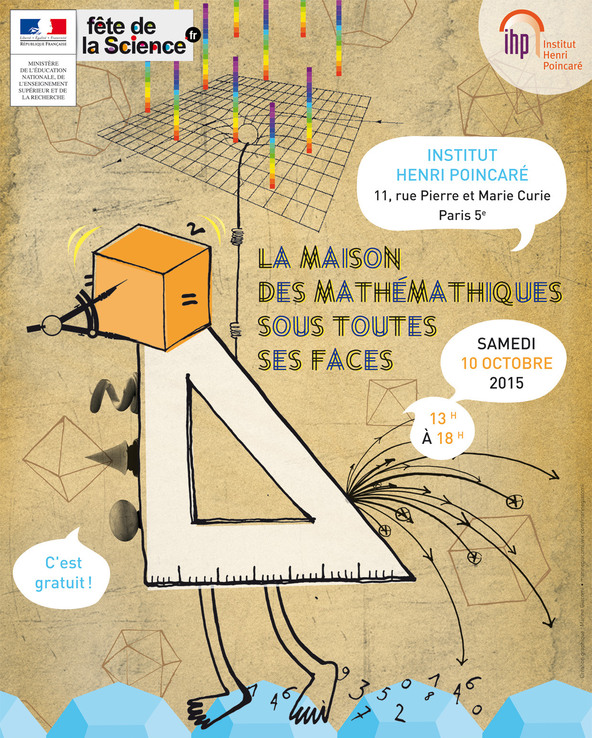 Co-organisé par l’IHP, Animath, la Fondation des Sciences Mathématiques de Paris, Parcours des sciences,Playmaths, Images des mathématiques et Imaginary, cet évènement s’inscrit dans la continuité des actions de promotion des mathématiques que mène l’Institut tout au long de l’année. L’objectif de cette journée est de rassembler mathématiciens, doctorants, associations et grand public autour des mathématiques au travers d’activités diverses et variées : conférences, balade thématique, expositions, speed-meeting avec doctorants, et bien entendu, des ateliers pour petits et grands !
