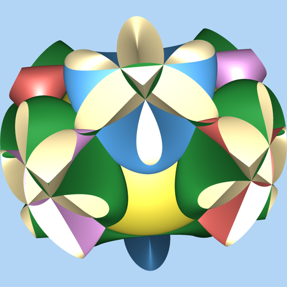 In the picture you see a yellow Roman Surface surrounded by six parts of the Roman Surface, meeting at the pinchpoints, emphasizing the high degree of symmetry of the surface.