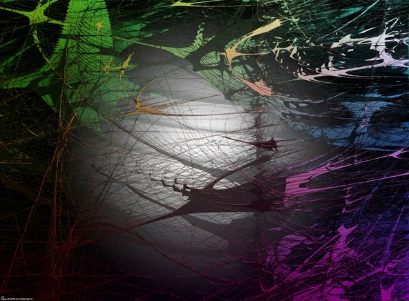 A foggy pseudo-octonionic Julia set computed with A=(-0.58...,+0.63...,0,0,0,0,0,0) with a rotation about the X axis -tridimensional cross-section-.