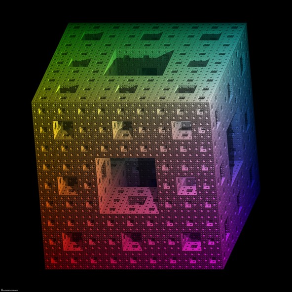Definition of the Menger sponge: A cube is cut into 3x3x3=27 identical smaller cubes. Then the 7 central subcubes (6 for each face and 1 at the center of the cube) are removed. At last this process is iterated recursively to the 27-7=20 remaining subcubes.
