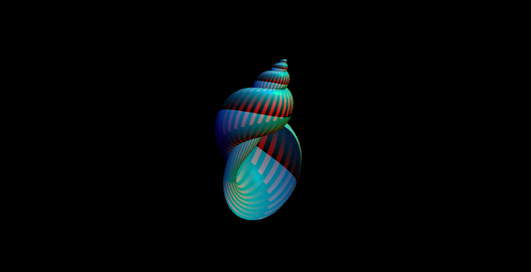 - for the shape (same in all examples): x(u,v)=exp(w* u)*(h+a* cos(v)) *cos(s *u), y(u,v)=r *exp(w* u)*(h+a *cos(v))* sin(c* u), z(u,v)=exp(w *u)*(k+b *sin(v)), a=5.2, b=7, w=0.125, h=3.23, s=1, r=-1, c=1.016789, k=-16, Umin=-24, Umax=2, Vmin=0, Vmax=2pi. for the colour and pattern ( under the tab "user coloration RBG"): Red(u,v)=tan(23000u-v), Green(u,v)=v, Blue(u,v)=v.