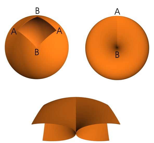 The (second) Boy surface can be cut into three mutually congruent pieces because of its three-fold symmetry. The picture shows the surface using a parametrization by Robert Bryant and additionally the same surface cut open and fallen apart to demonstrate the symmetry as well as the beauty inside.