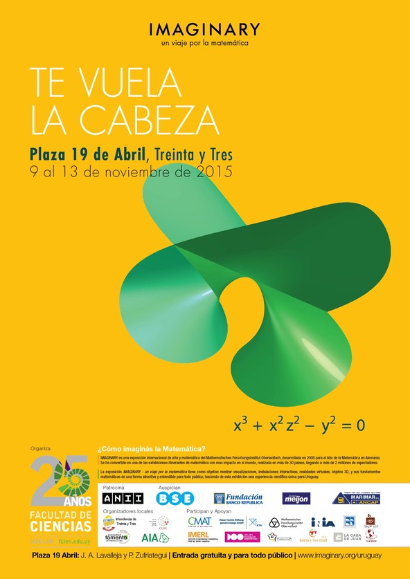 Facultad de Ciencias en conjunto con Intendencia Municipal de Treinta y Tres, Centro Universitario de la Región Este (UdelaR), Sociedad Fomento de Treinta y Tres, y Centro Agronómico Regional de Treinta y Tres organizan y convocan a visitar la exposición IMAGINARY - un viaje por la matemática, que se llevará a cabo entre el 9 y el 13 de noviembre de 2015, en la Plaza 19 de Abril de la ciudad de Treinta y Tres, Uruguay. Se trata de la primera exposición interactiva de matemática en el interior del país, de entrada gratuita y apta para todo público. Se podrá visitar de lunes a viernes entre las 9 y 12 hs, y las 14 y 18 hs. con horario extendido hasta las 21 hs el Jueves y Viernes.