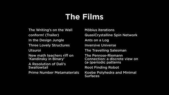 The festival is part of the Bridges Conference. It presents an annual reel of mathematical short films, videos and animations that have been created for educational, corporate and artistic purposes, or just for fun.
