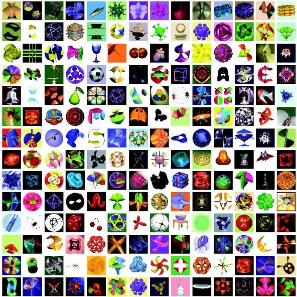 In collaboration with the Mathematisches Forschungsinstitut Oberwolfach we collect images of algebraic surfaces generated with the SURFER program. Have a look at some of the past creative surfaces from a previous competition below!