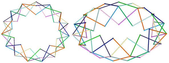 It is easy to construct 2D stars as closed polyline with constant angle between the segments. But what about 3D stars? I tried to construct 3D stars using the same angle between adjacent segments and between two planes spanned by three adjacent segments. Indeed for specific angles closed polylines can be found in 3D-space forming interesting shapes. Also I varied the sequence of the direction of plane rotation when stepping from one segment to the next one.
