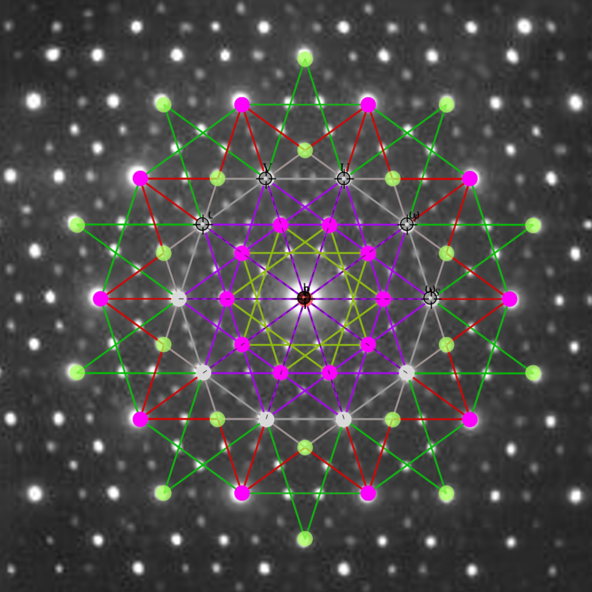 240 E8 polytope vertices projected to 2D using 5-cube Petrie basis vectors overlaid on electron diffraction pattern of an icosahedral Zn-Mg-Ho Quasicrystal. The number of overlapping vertices in the projection are indicated by colors.