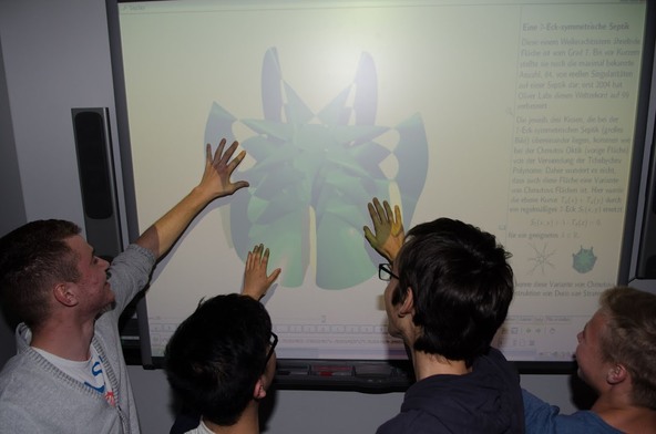 A small IMAGINARY exhibition will be shown at the Max-Planck-Gymnasium in Göttingen. The focus will be on the algebraic geometry program SURFER, visualising algebraic surfaces and giving the opportunity to explore the math behind the beautiful pictures.