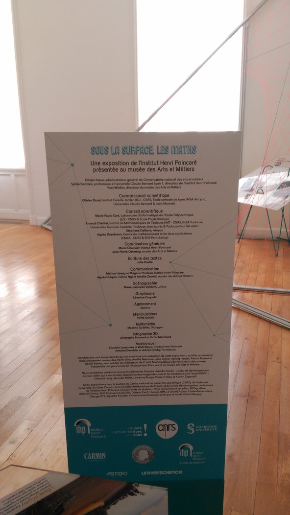 The temporary exhibition “Sous la surface, les maths” (under the surface, the maths) organized by Institut Henri Poincaré for the Arts et Métiers museum, in Paris, features some exhibits from IMAGINARY.