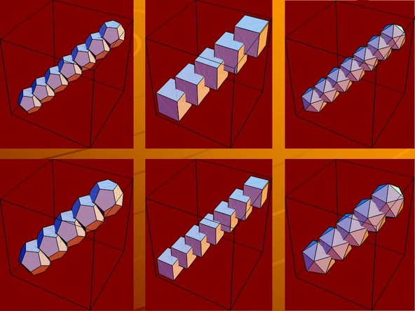 Icosahedrons, Hexahedrons and Dodecahedrons made by Graphics3D, Table in Mathematica.