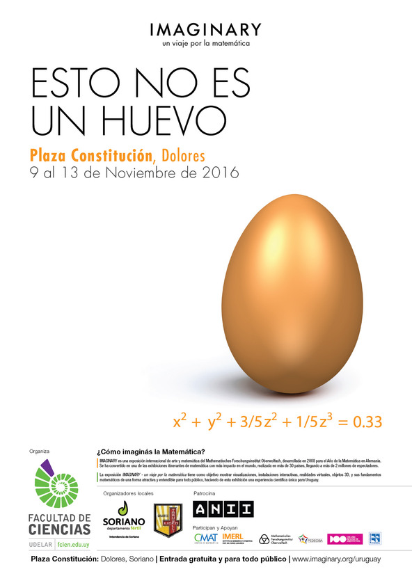 Las facultades de Ciencias, Ingeniería y Arquitectura trabajan en conjunto con el Liceo Nro. 1 “Dr. Roberto Taruselli” de Dolores, el Municipio de Dolores, y la Intendencia de Soriano, y convocan a visitar la exposición IMAGINARY - un viaje por la matemática, que se llevará a cabo entre el 9 y el 13 de noviembre de 2016, en la plaza principal de Dolores, Soriano. Se trata de la primera exposición interactiva de matemática en el departamento de Soriano, de entrada gratuita y apta para todo público. Se podrá visitar de Miércoles de 15hs a 19hs, Jueves y Viernes entre las 9 y 12 hs, y 15hs a 19 hs, Sábado y Domingo de 10hs a 13hs, y de 16hs a 22hs.
