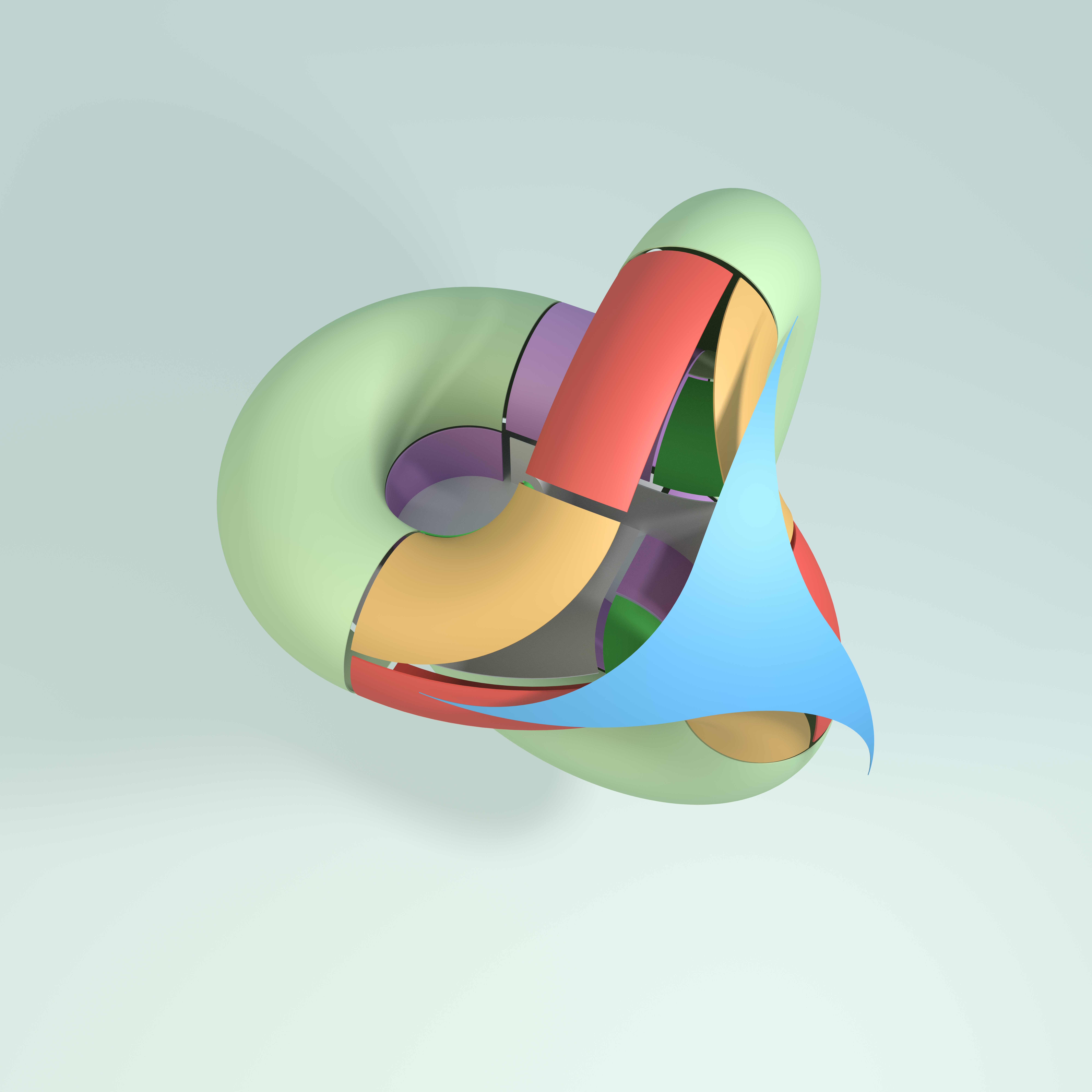 The blue piece is part of a sphere, cut by cylinders and rectangles. It is quite a miracle that it smoothly fits to close the surface.