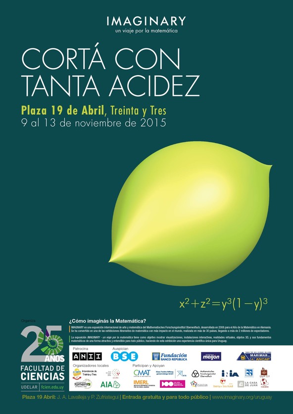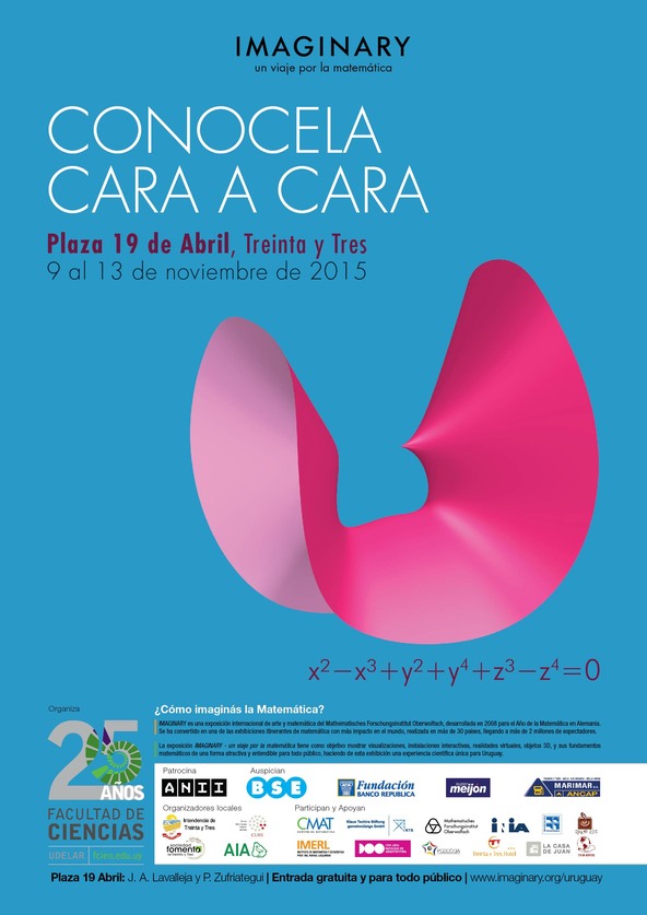 Facultad de Ciencias en conjunto con Intendencia Municipal de Treinta y Tres, Centro Universitario de la Región Este (UdelaR), Sociedad Fomento de Treinta y Tres, y Centro Agronómico Regional de Treinta y Tres organizan y convocan a visitar la exposición IMAGINARY - un viaje por la matemática, que se llevará a cabo entre el 9 y el 13 de noviembre de 2015, en la Plaza 19 de Abril de la ciudad de Treinta y Tres, Uruguay. Se trata de la primera exposición interactiva de matemática en el interior del país, de entrada gratuita y apta para todo público. Se podrá visitar de lunes a viernes entre las 9 y 12 hs, y las 14 y 18 hs. con horario extendido hasta las 21 hs el Jueves y Viernes.