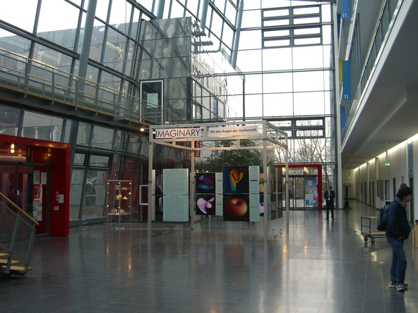 The first IMAGINARY exhibition takes place at the Campus Garching of the Technical University of Munich. It features the IMAGINARY cube with 39 images of algebraic surfaces, a showcase with several exhibits, a film station and three interactive stations where visitors can use mathematical software. School groups and individual visitors can get explanations and guided tours by students of the TU Munich.