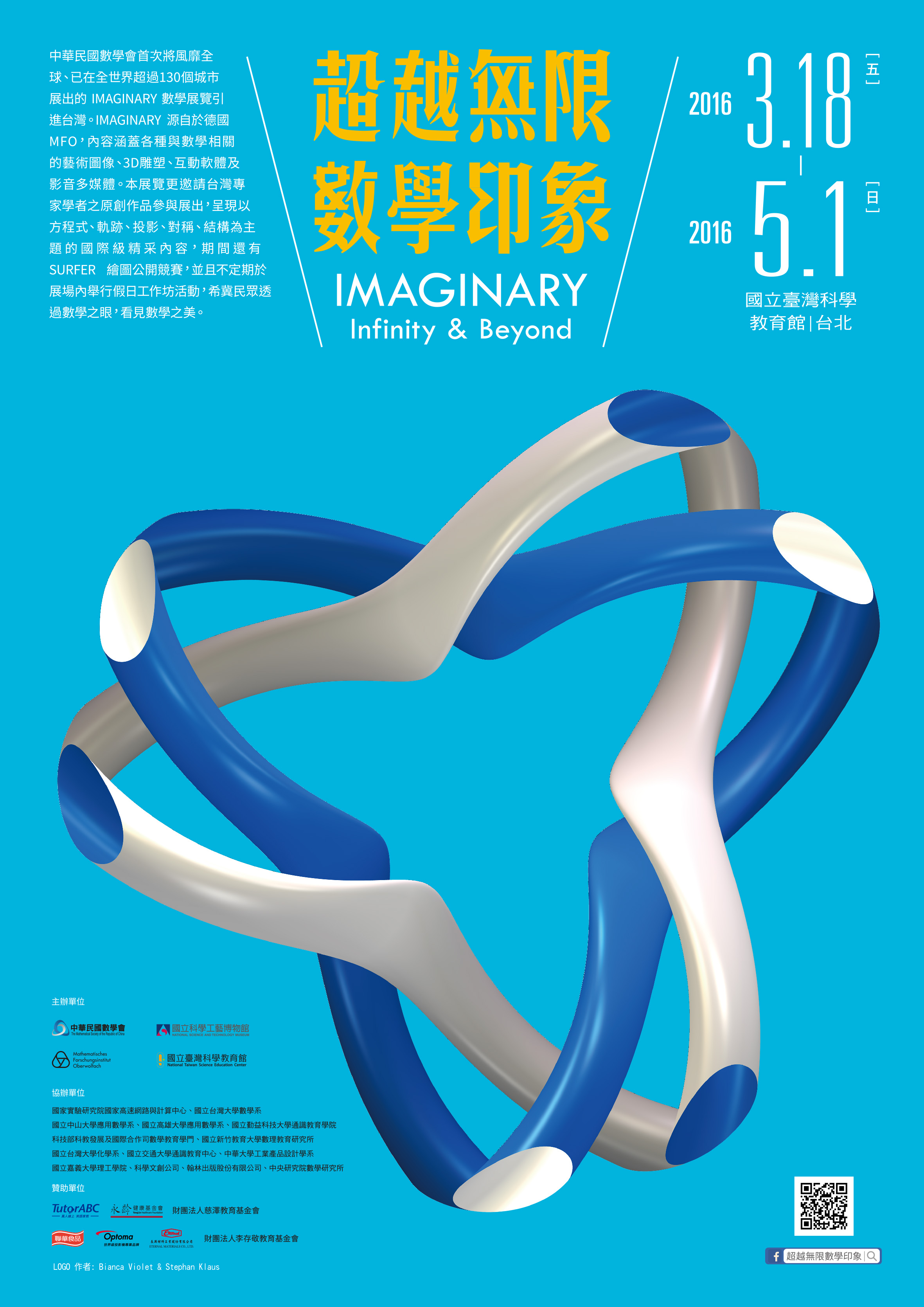 The exhibition demonstrates a variety of mathematical content from IMAGINARY and invited some experts in Taiwan to contribute their works combining mathematics and arts. Based on the experience in Kaohsiung, the Taipei Exhibition will have a slight modification. In particular, we add some new content contributed by Rinus Roelofs, a mathematical artist. For details about Rinus, please visit his website.