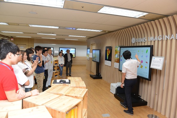 Continuing from the big success of NIMS-IMAGINARY exhibition in collaboration with MFO at ICM 2014, the National Institute for Mathematical Sciences (NIMS) now provides a permanent exhibition at Daejeon, which is the first IMAGINARY branch in Korea. It features 6 touchscreen panels with a wide variety of mathematical programs together with gorgeous posters and sculptures.