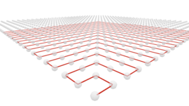 Solution of the wave equation on a sphere. Reflecting obstacles have been placed around the vertices of a cube. The initial state is composed circular waves concentrated at the centers of the...