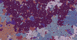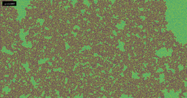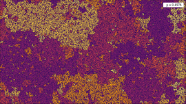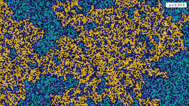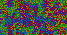 Solution of a reaction-diffusion equation involving five chemicals, each of them dominating two others. There are two interaction parameters, which are equal at the beginning of the simulation. As...