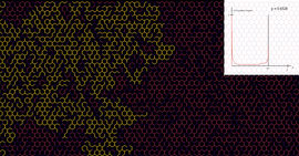 Bernoulli site percolation on a lattice of equilateral triangles (whose centers form a hexagonal lattice), for different lattice sizes. Open clusters are colored according to their size.