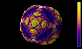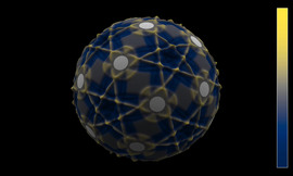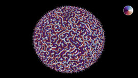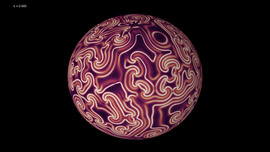 Solution of the wave equation on a sphere. Reflecting obstacles have been placed around the vertices of a regular octahedron. The initial state is a set of circular waves of alternating sign,...