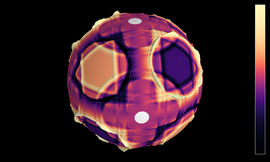 Solution of the wave equation on a sphere. Reflecting obstacles have been placed around the vertices of a regular dodecahedron. The initial state is a set of circular waves concentrated at the...