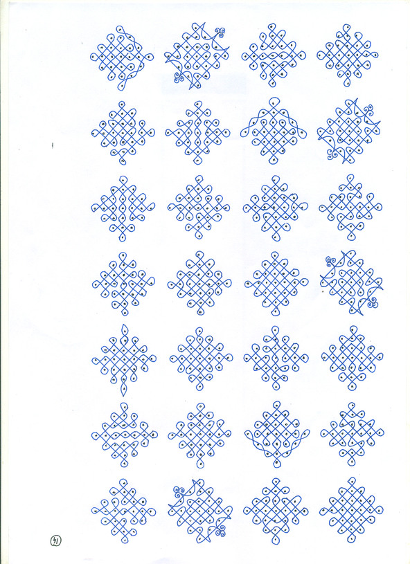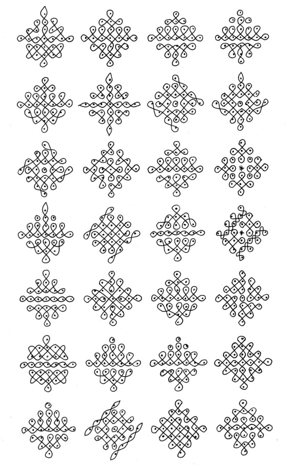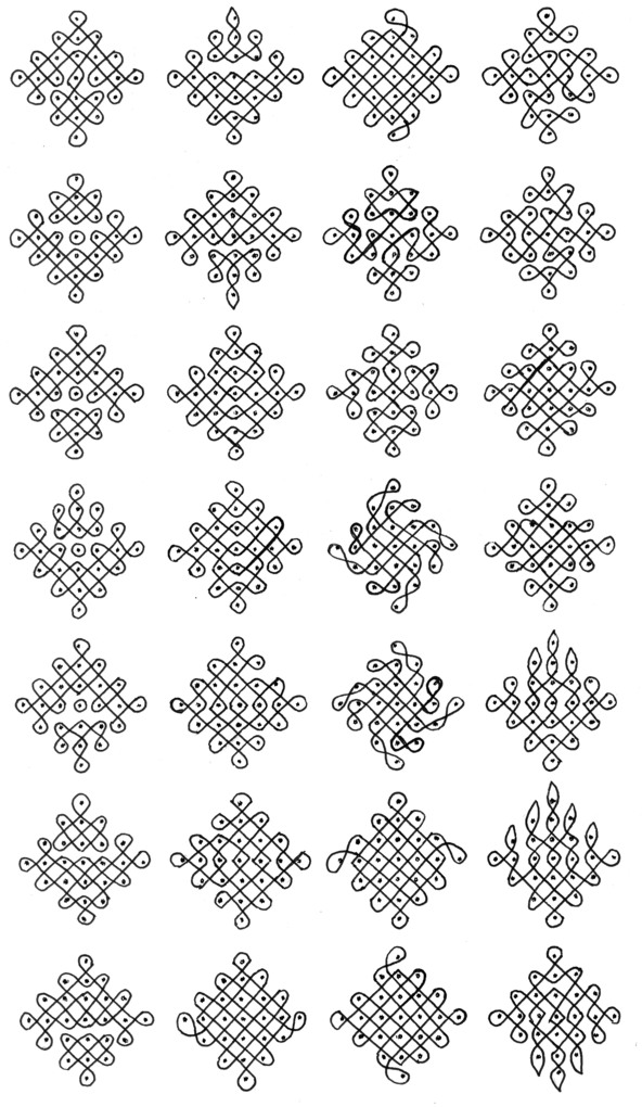 In the art form of kolam, dots called pulli are arranged in rhombic, square, triangular, or free shapes, and a single, uninterrupted linear or curvilinear line, called the kambi, intertwines the dots. (Reference Wikipedia)