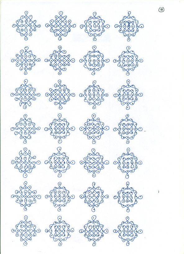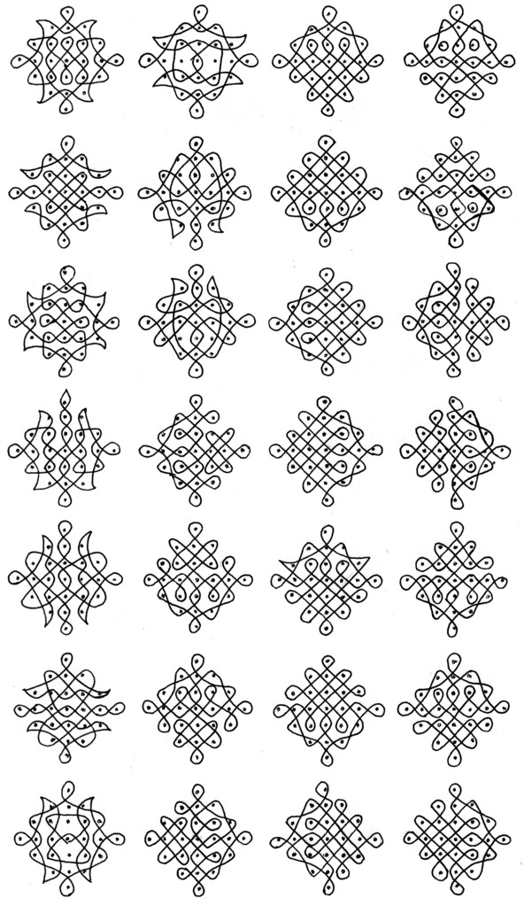 A kolam is a geometrical drawing composed of curved loops drawn around a grid pattern of dots. It is sometimes called Rangoli and can be very elaborate and colorful. Kolams originated about 2500 BC in the Indus Valley Civilization and are believed to help bring wealth and prosperity to the home or business.