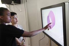 Un autre écran tactile présente le programme interactif sur la géométrie Cendrillon. Les visiteurs peuvent créer aisément et rapidement des constructions géométriques incluant des fractales. Par ailleurs, certains peuvent effectuer des simulations physiques avec des masses, des ressorts et des domaines. Cela permet aussi de retravailler et de compléter les objets exposés consacrés à d’autres thèmes. Libre des limitations de la réalité, on peut simuler des scénarios venant de divers domaines tels la méchanique, la physique des atomes et le mouvement des planètes.