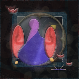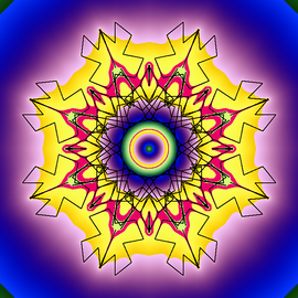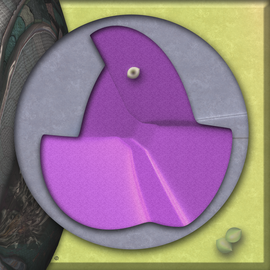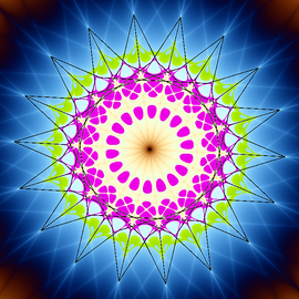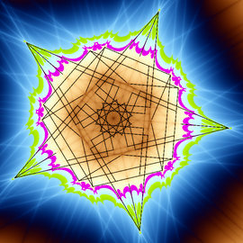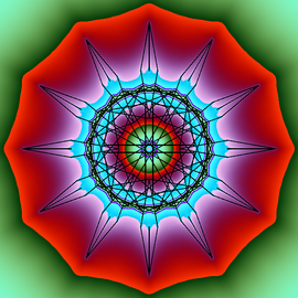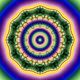 Solution of a reaction-diffusion equation with three fields on the sphere. Each species beats one of the others, and is beaten by the other one. The color hue and radial coordinate show the vorticity of a phase variable derived from the concentrations.