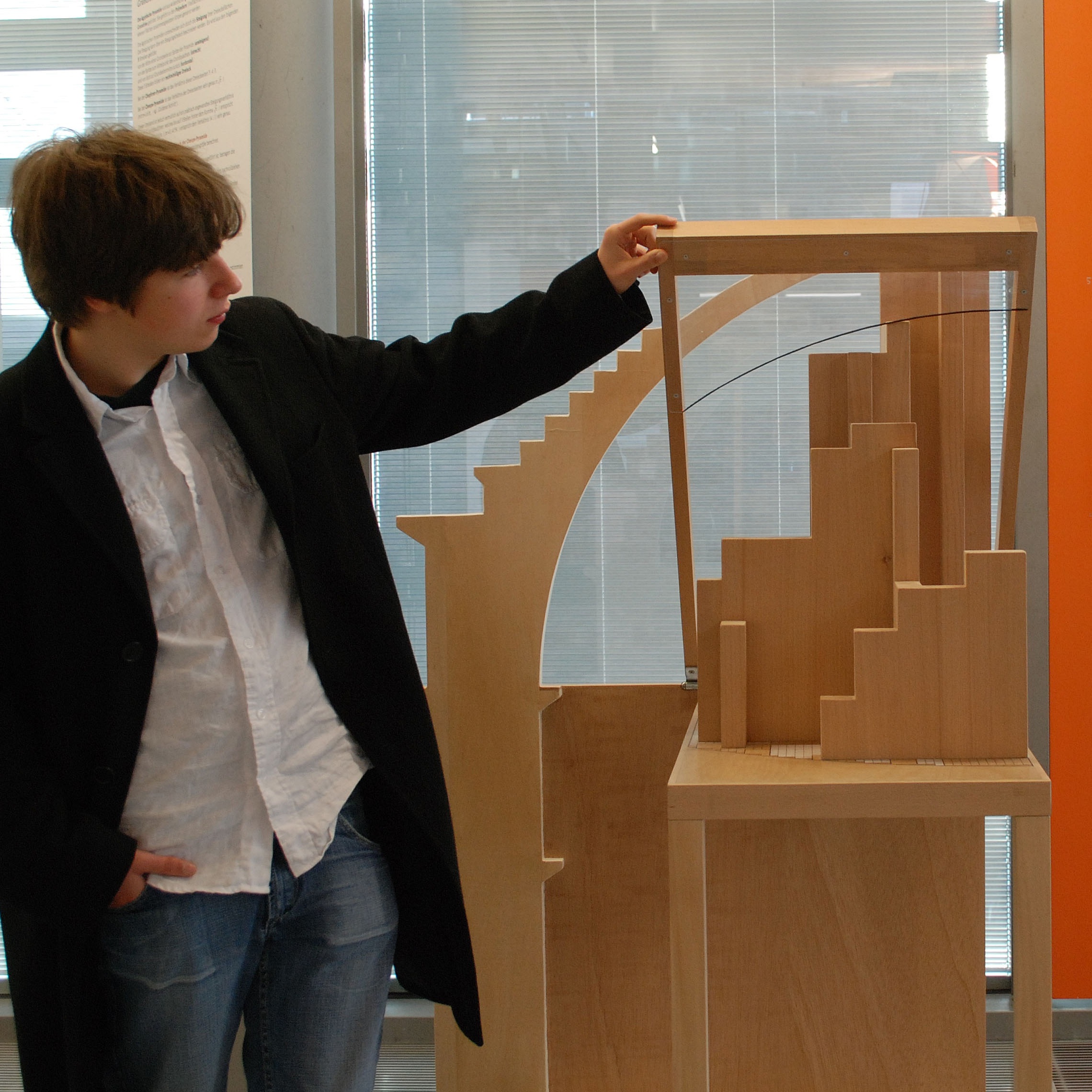 The young man is moving the bow of the Pythagorean Sphere Model. In doing so the inlayed black line segment of a circle circumscribes a sphere with radius 65 cm.