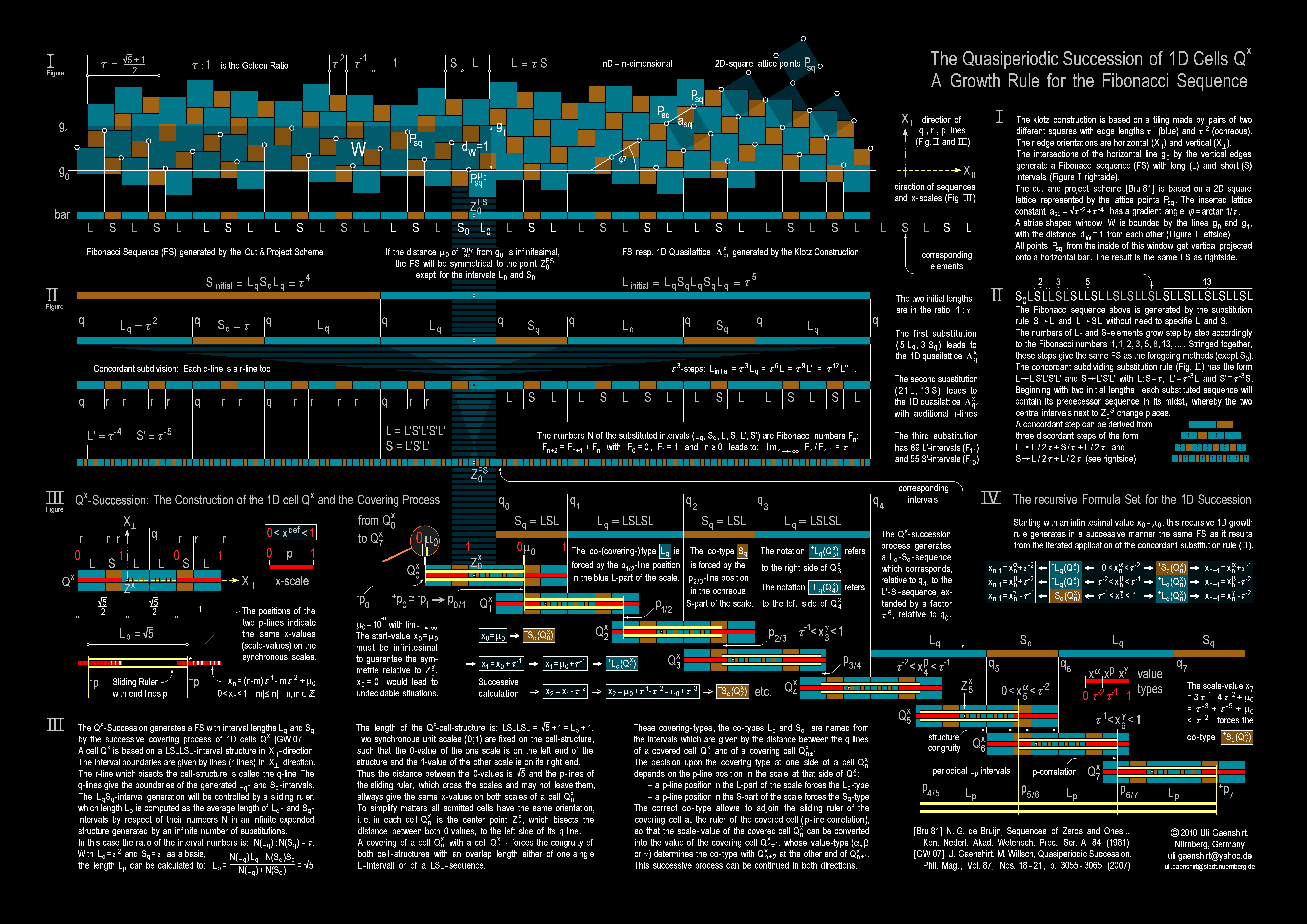 The one dimensional (1D) quasi-cells in the upper part of the image generate the quasiperiodic sequence step by step. The successive growth is forced by sliding rulers (yellow). The rulers have a periodic average length. By connecting their end-marks, as shown in the image, the mechanisms of the quasi-cells force the growth of a perfect quasiperiodic sequence.