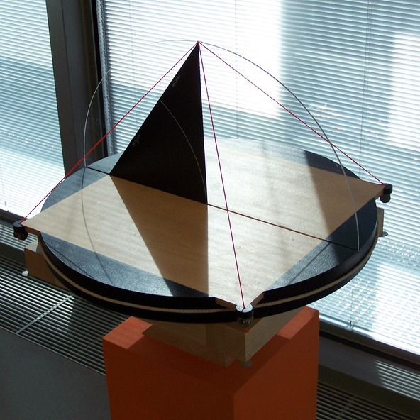 The object in the foreground is a Spatial Pythagorean Stick Model. At the fixed vertical bar three marbles are countersunk, in the height of 7 units (red), 8 units (green) and 9 units (blue). Some complements are countersunk into the plane with respect to the possible integer Pythagorean solutions. The provided sticks with marked units have the lengths of integer diagonals.