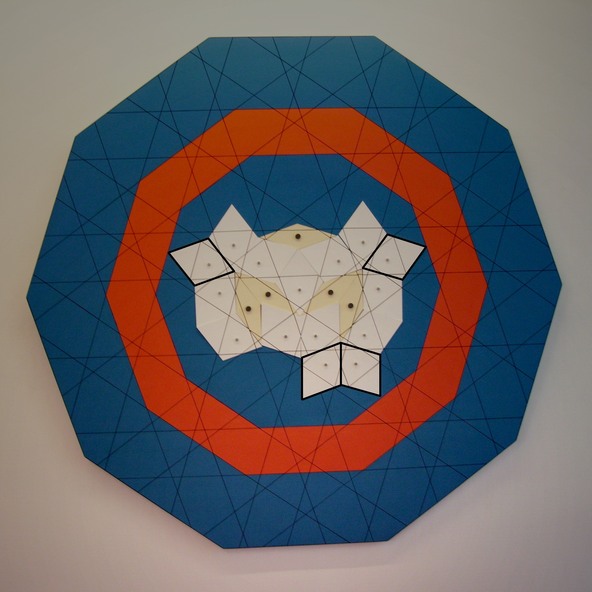 The thick white and the small yellowish Penrose rhombs, which are magnetically fixed in the decagon center, are marked with specified cuts of the Ammann grid. The matching rules of the Penrose rhombs force the continuation of these lines from rhombus to rhombus.